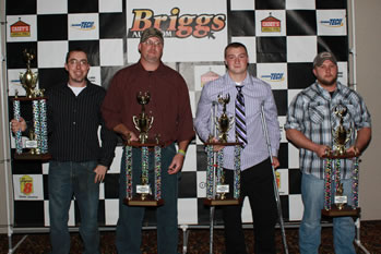| From left to right. Modified Champ, Darron Fuqua, Factory Stock Champ, Dave Samuels, B Mod Champ Dalton Kirk & Pure Stock Champ Zach Henery. Reed Bros. Racing Photos |
